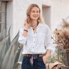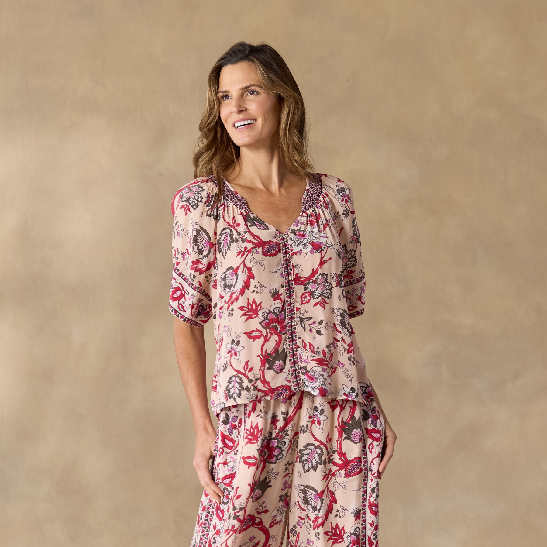 Silky and gorgeous mixed and border print pajama top. so elegant with smocked neckline and eyelet laundry button front. Easy fit. Viscose. Machine wash. Imported. Exclusive. Sizes XS (0–2). S (4–6). M (8–10). L (12–14). XL (16–18). XXL (20–22). Approx. 23l.