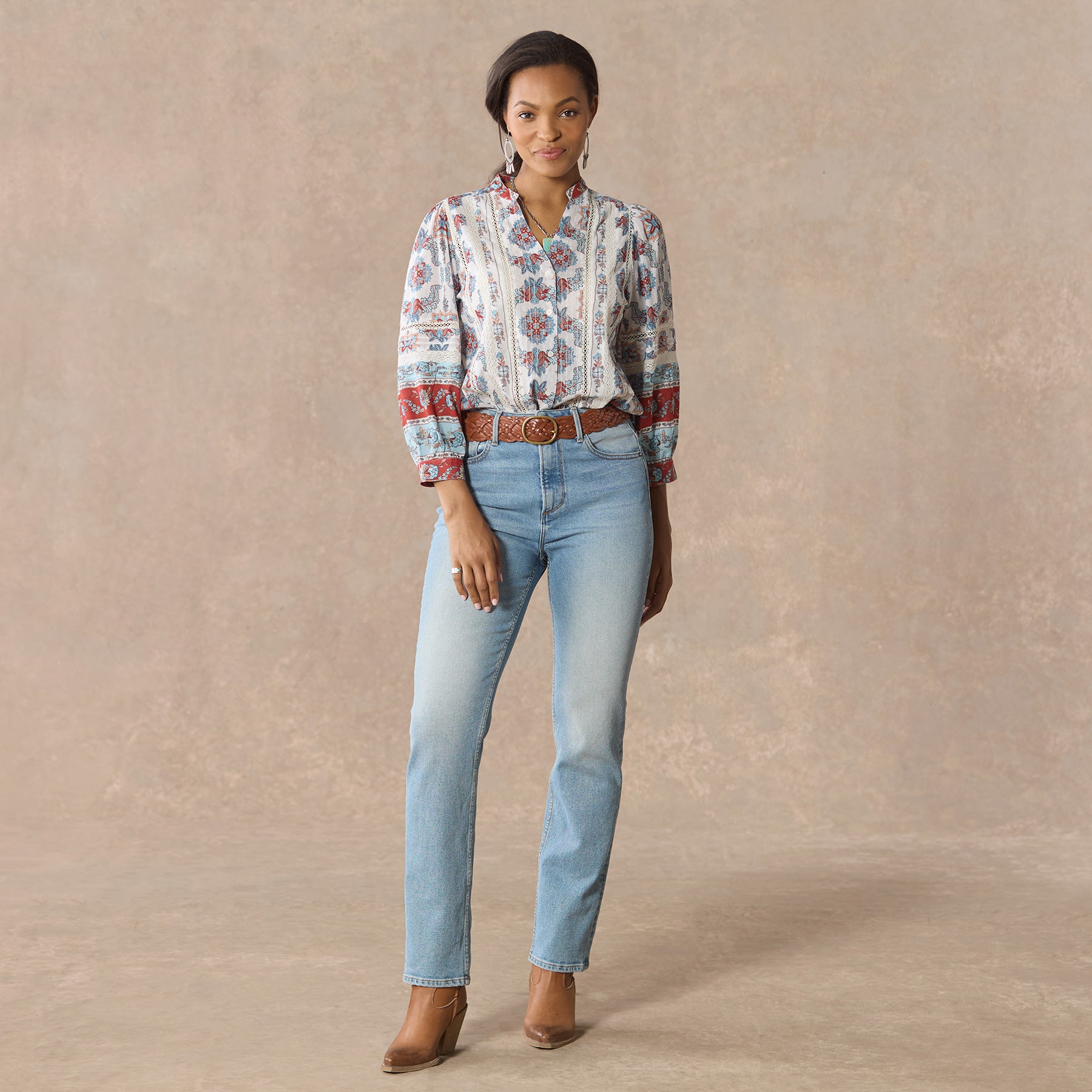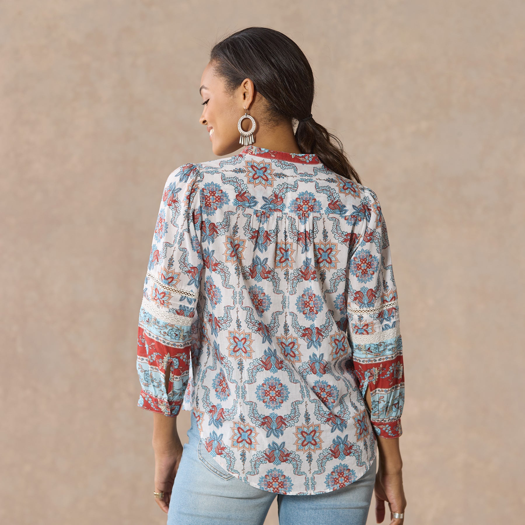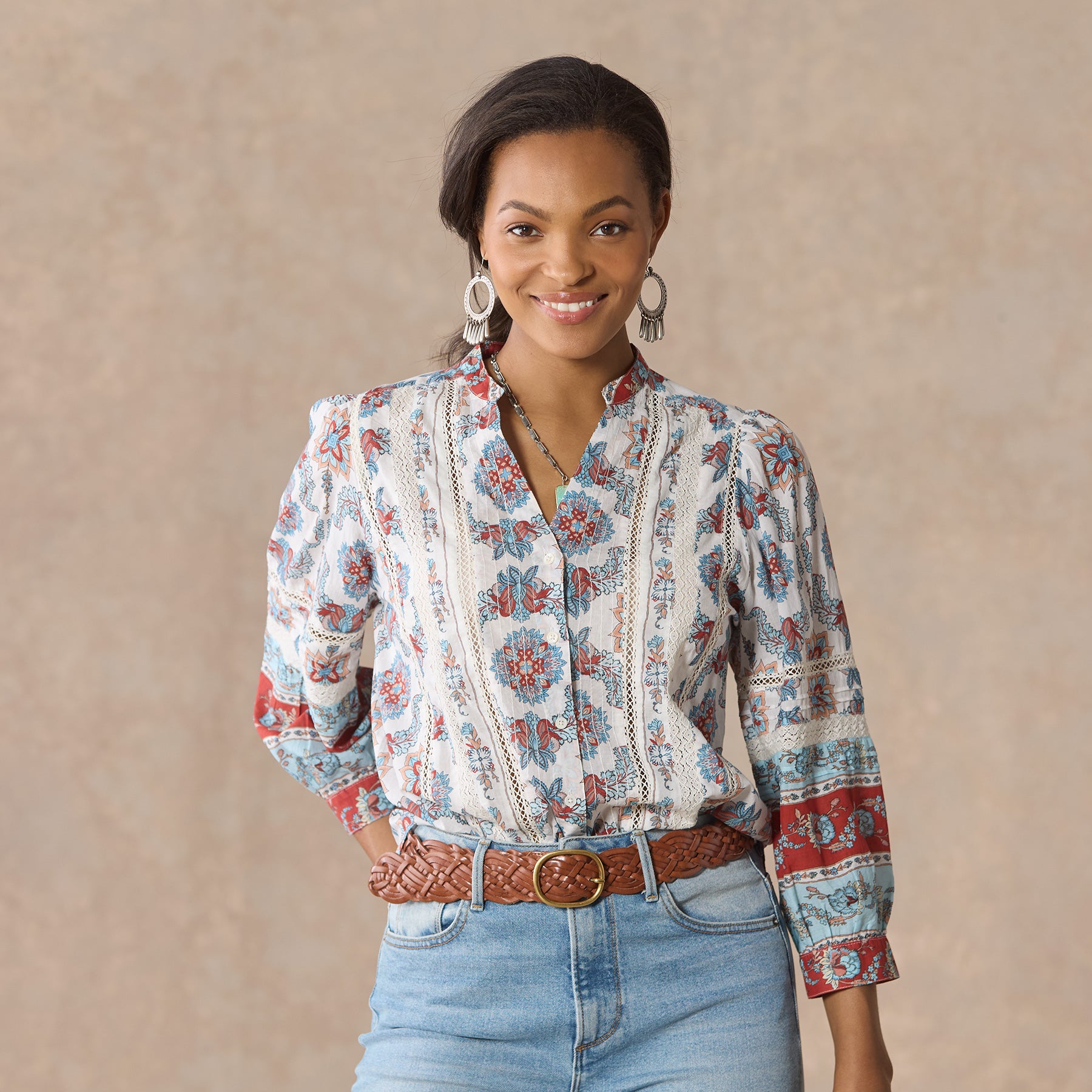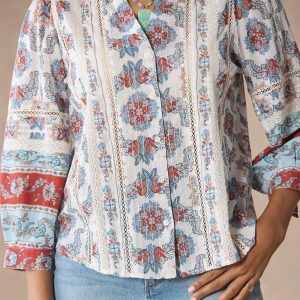 Our easy. mixed print shirt with a beautiful border print is complete with feminine pintucks and lace trim insets at the center front. Three-quarter sleeves. Shirttail hem. notch neckline. Cotton. Machine wash. Imported. Exclusive. Sizes XS (0–2). S (4–6). M (8–10). L (12–14). XL (16–18). XXL (20–22). Approx. 25.5l.