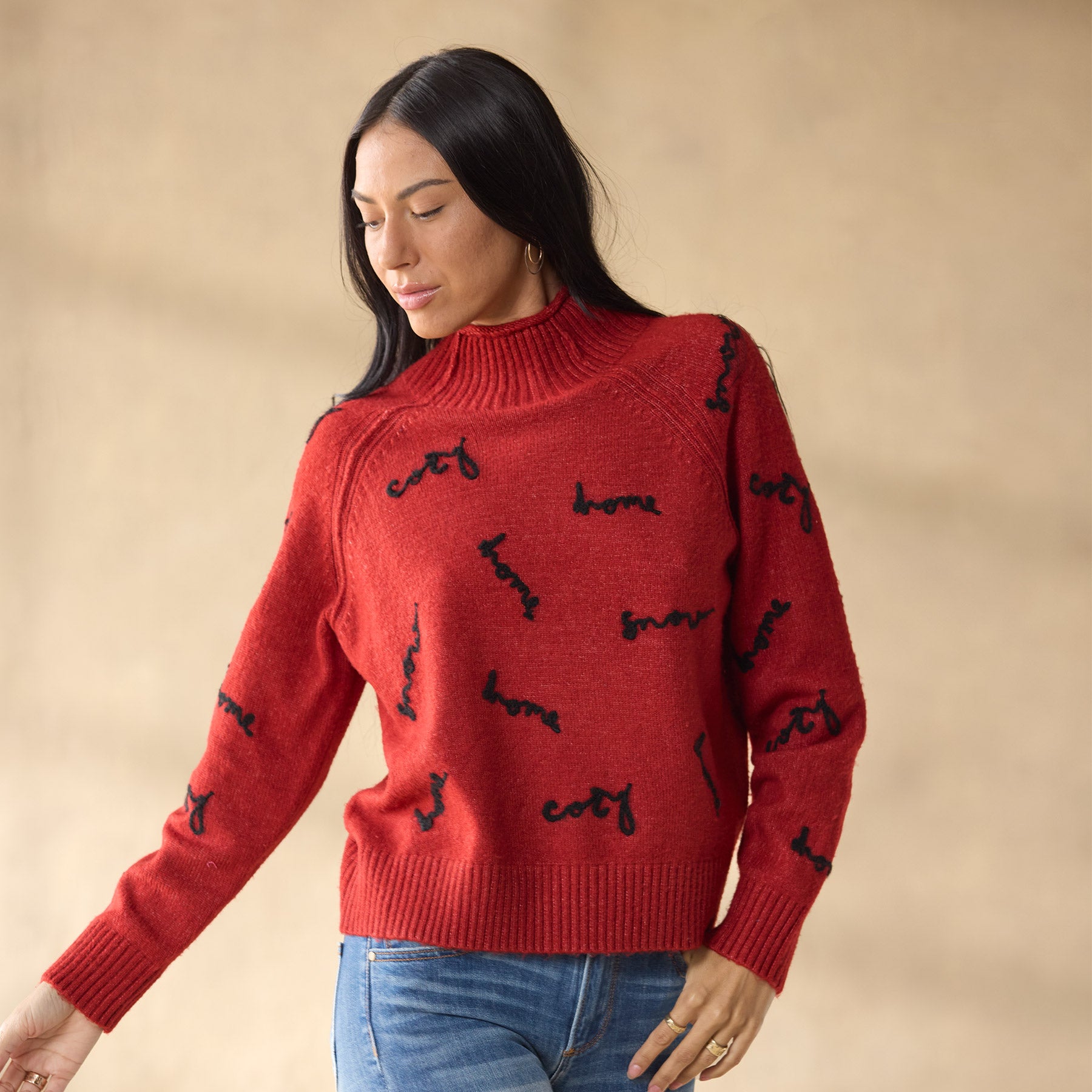 Our cozy sweater features the machine-embroidered sentiments cozy. home and snow. An allover rib with mock neck. rib trim. jersey roll neckline and exposed seaming at raglan sleeves. Acrylic/nylon. Hand wash. Imported. Exclusive. Sizes XXS (00). XS (0–2). S (4–6). M (8–10). L (12–14). XL (16–18). Approx. 21l.