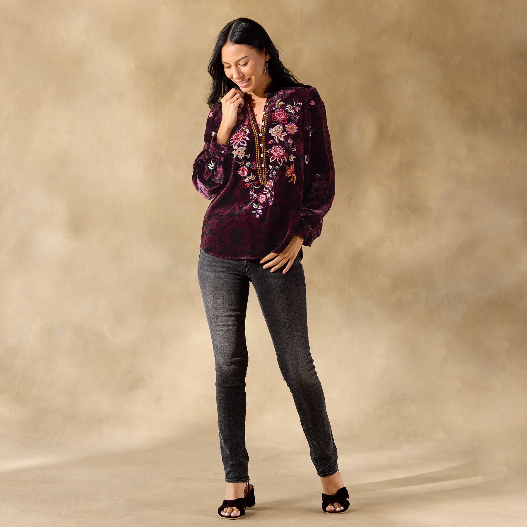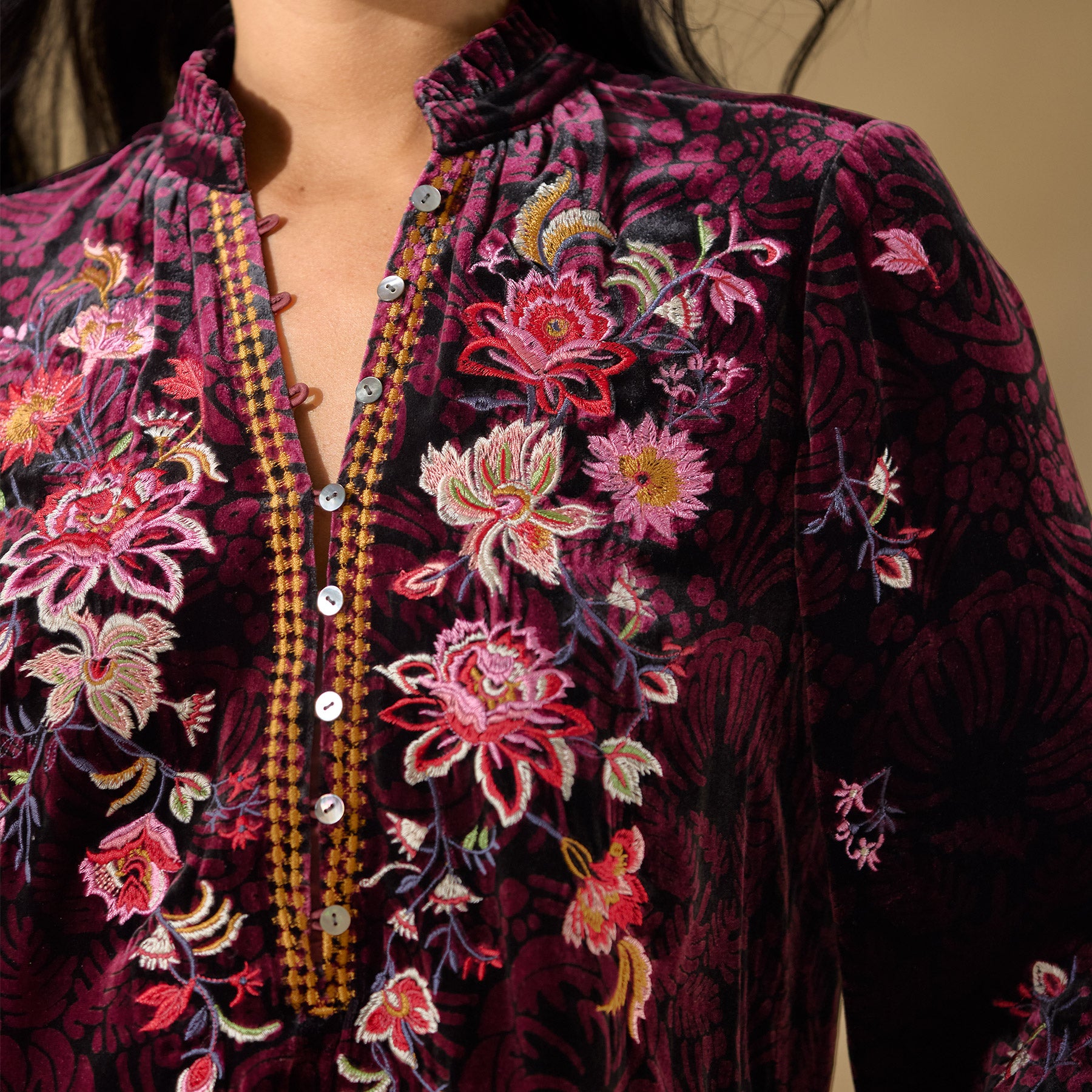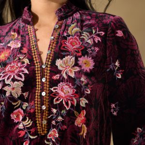 Inspired by a garden in full bloom—colorful embroidery blossoms on our printed. relaxed fit top with ruffle detail at the notch neckline and loop button closure at the henley placket. Viscose/silk. Dry clean. Imported. Exclusive. Sizes XS (0–2). S (4–6). M (8–10). L (12–14). XL (16–18). XXL (20–22). Approx. 25.5l.