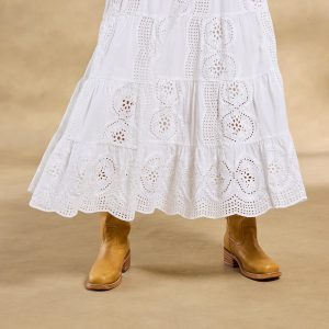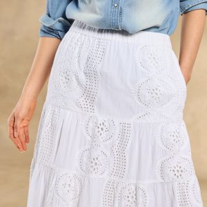 Our easygoing Ensenada Skirt features breezy tiered eyelet in a versatile midi length with a forgiving elastic waistband and a charming scalloped hem. Cotton. Machine wash. Imported. Exclusive. Sizes XXS (00). XS (0?C2). S (4?C6). M (8?C10). L (12?C14). XL (16?C18). Approx. 33l.