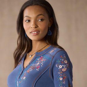 Lovely. multicolored floral and geometric embroidery graces our fitted. notch neck henley with contrast stitching detail. rib trim and princess seams. Metal buttons. Cotton. Machine wash. Imported. Exclusive. Sizes XS (0–2). S (4–6). M (8–10). L (12–14). XL (16–18). XXL (20-22). Approx. 26l.