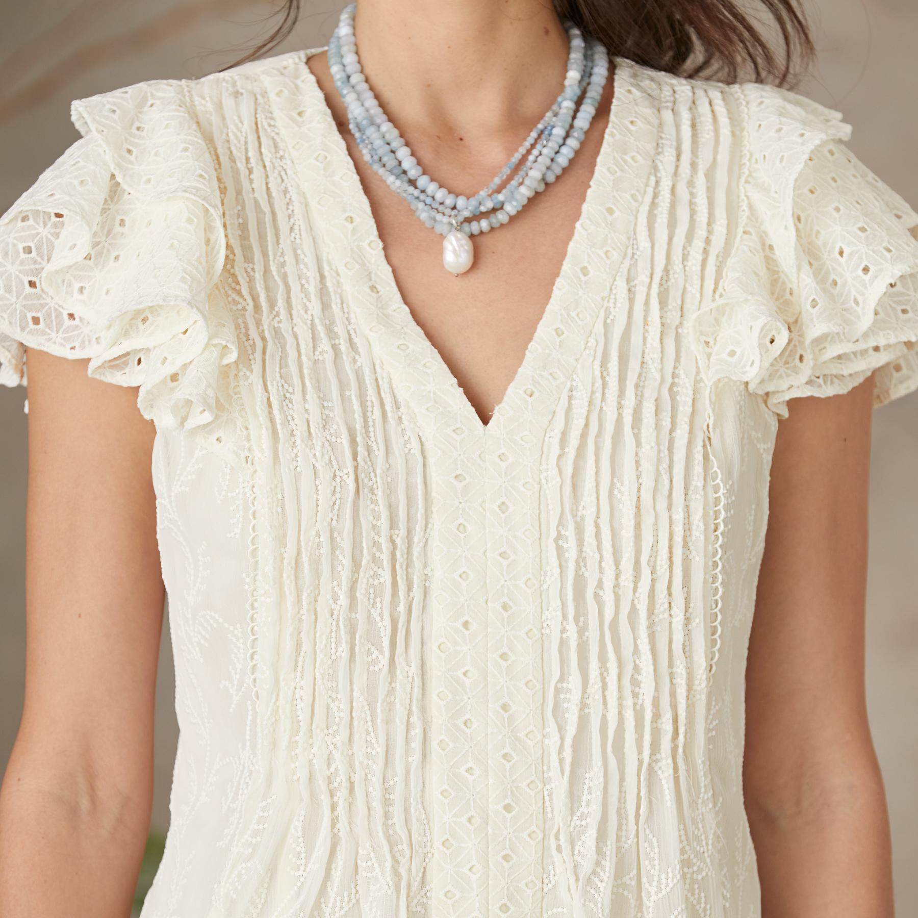 Allover tonal embroidery. flutter sleeves. pintuck details and lace panel enhance this ultrafeminine blouse. Fully lined. Polyester. Hand wash. Imported. Sizes XS (0-2). S (4-6). M (8-10). L (12-14). XL (16-18). XXL (20-22). Approx. 25l.