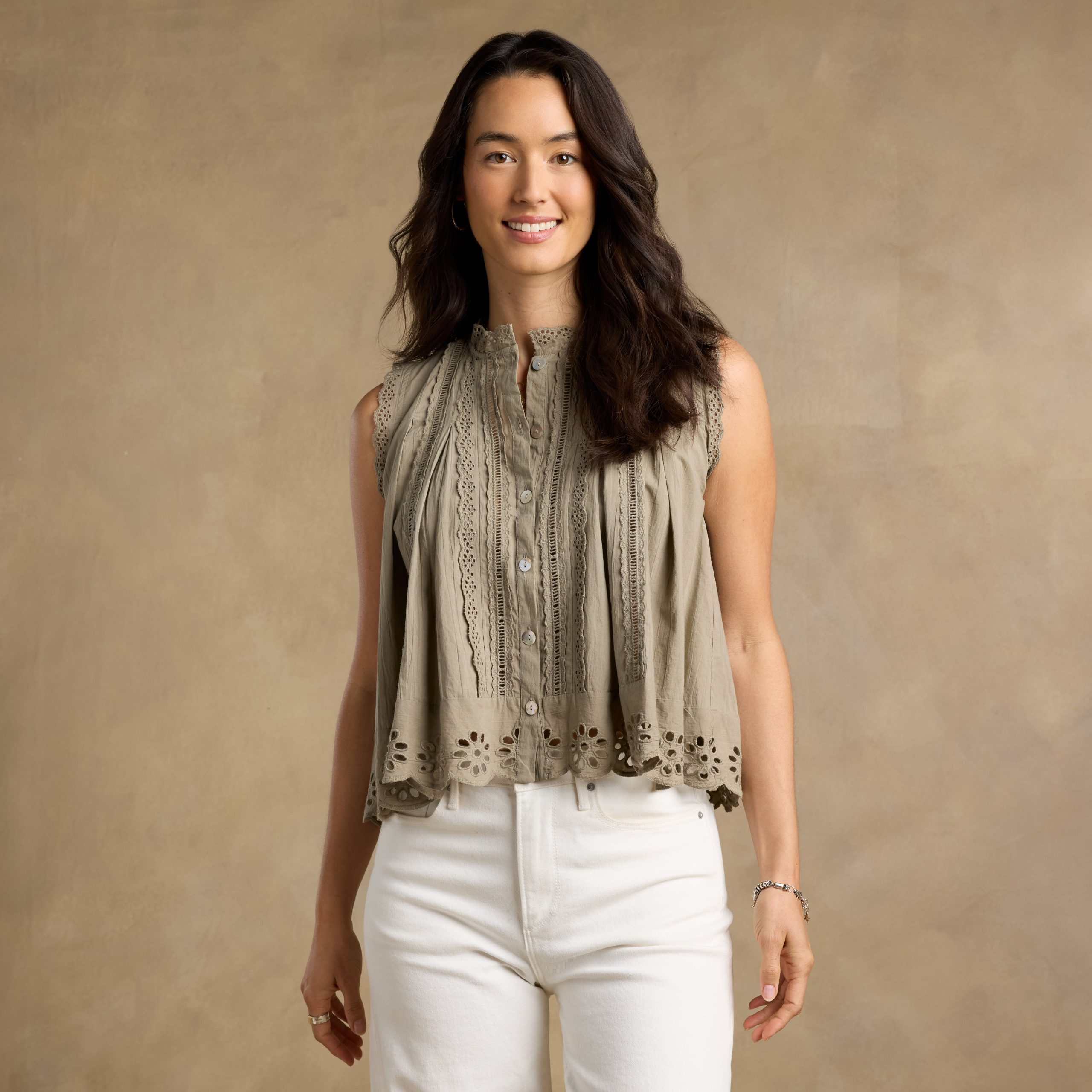 Equal parts effortless and feminine. our Malia Eyelet Top features a swingy pleated silhouette with real shell buttons. delicate lace details at the collar and armholes and a scalloped eyelet hem. Cotton. Machine wash. Imported. Sizes XS (0–2). S (4–6). M (8–10). L (12–14). XL (16–18). XXL (20–22). Approx. 23l.