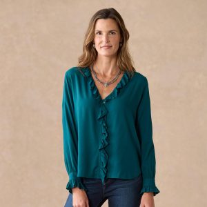 This classic. button-up blouse has timeless style and a fresh. feminine twist with ruffle details at neckline and cuffs. Beautifully draping. with back pleat and slight shirttail hem. Rayon. Machine wash. Imported. Sundance exclusive. Sizes XS (4). S (6). M (8?C10). L (12). XL (14). XXL (16). Approx. 25.5l.