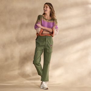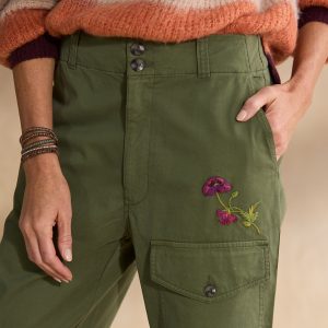 Overflowing with beautiful detail. our asymmetrical floral embroidered cargo pants feature a flattering Hollywood waist with two buttons. five pockets and a straight leg fit. Cotton/lycra. Machine wash. Imported. Exclusive. Sizes 2?C16. 26.5 inseam.