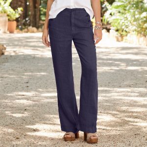 Our easy. menswear inspired wide leg pants with two front seam pockets. two back patch pockets. Zip front. Linen. Machine wash. Imported. Exclusive. Sizes 2-16. 32.5 inseam.
