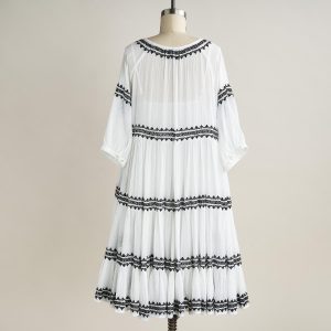 Soft and flowy. cotton gauze in a lovely tiered design imbues this dress with a brilliant. laid back vibe. embellished with banded. button cuffs. and geometric embroidery along each tier and center placket. Unlined. Cotton. Hand wash. Imported. Exclusive. Sizes XS (0 to 2). S (4 to 6). M (8 to 10). L (12 to 14). XL (16 to 18). XXL (20 to 22). Approx. 40-1/2L.