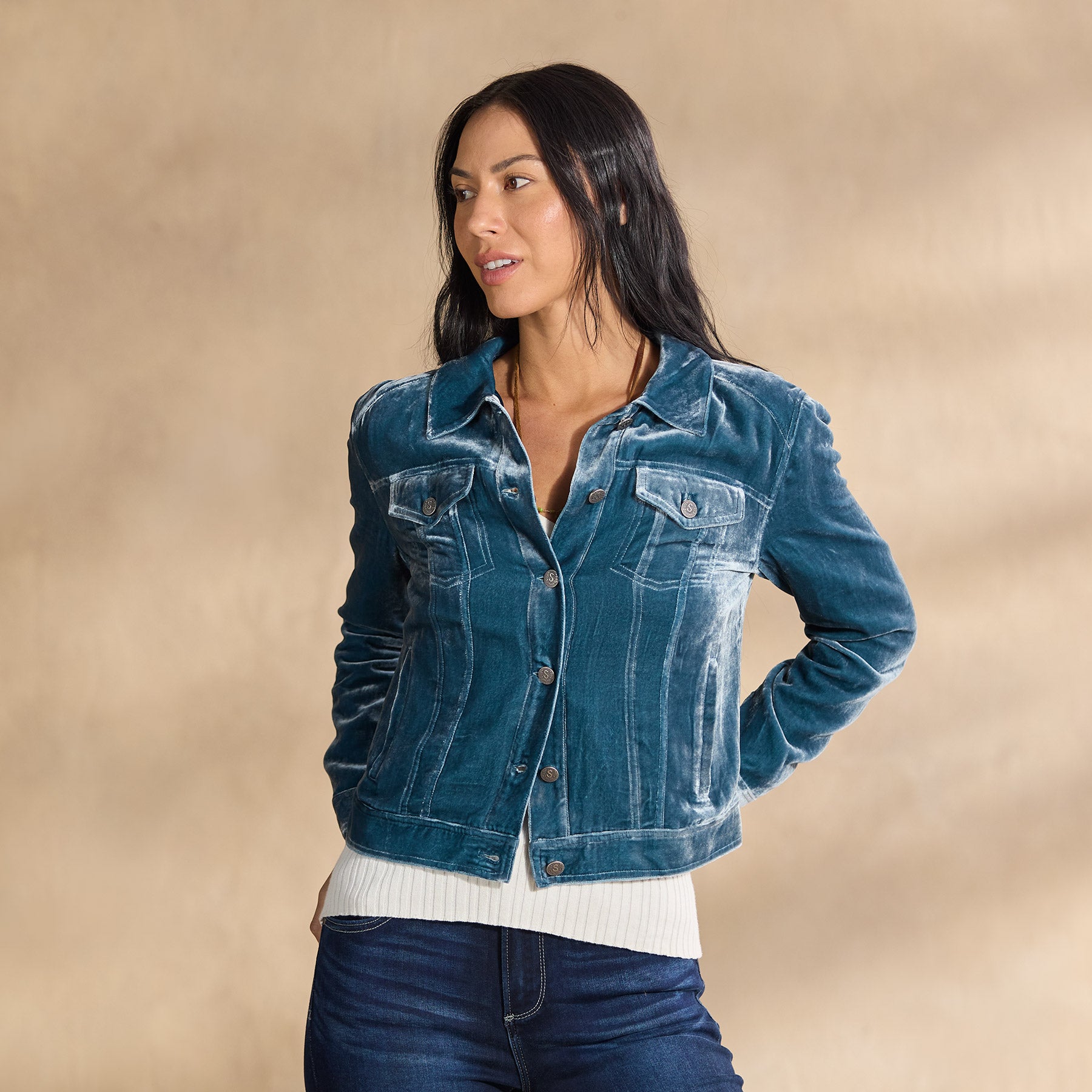 A classic jean jacket silhouette. but in soft. subtly shimmery velvet. Dress it up or down. Fully lined. Four pockets. Viscose/silk. Dry clean. Imported. Exclusive. Sizes XXS (00). XS (0?C2). S (4?C6). M (8?C10). L (12?C14). XL (16?C18). Approx. 20l.